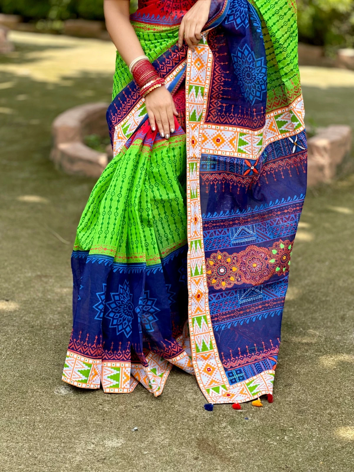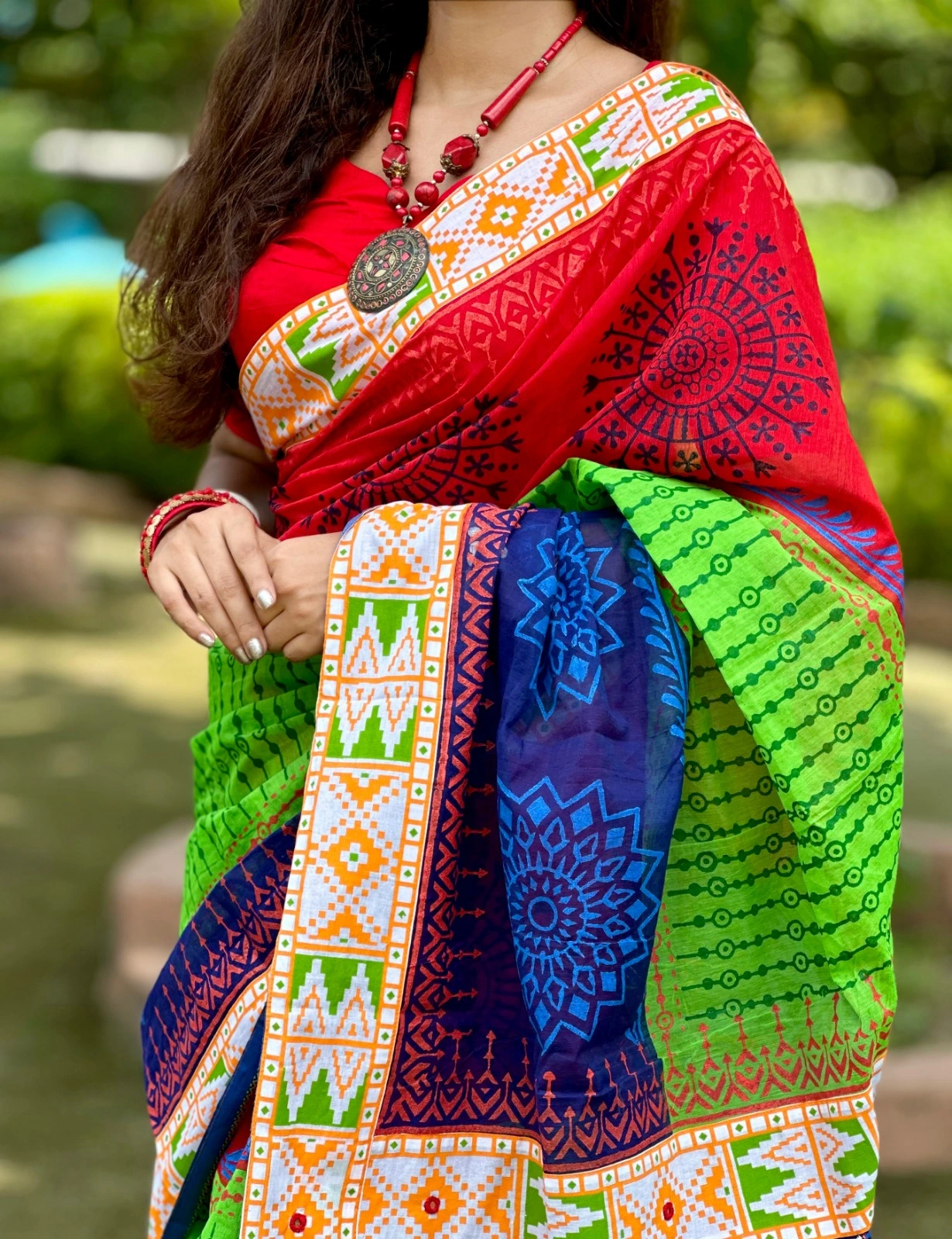 দক্ষ কারিগরের হাতে তৈরি এই শাড়িতে রয়েছে মনোমুগ্ধকর ব্লকের কাজ এবং হাতের সুতার সূক্ষ্ম নকশা। হালকা ও আরামদায়ক তাত কটন কাপড়, গরমে পরতে একেবারে উপযুক্ত।